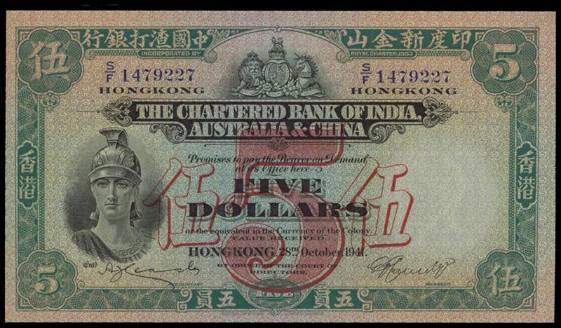 Chartered Bank of India, Australia and China, $5, 28 October 1941, serial number S/F 1479227, green and pink, helmeted male head at left, arms top centre, value in red underprint at low centre, two printed signatures at low left and right, reverse green, boats and value