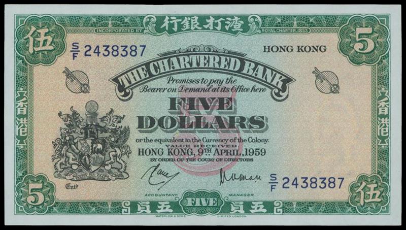 Chartered Bank, $5, 9 April 1959, serial number S/F 2438387, black on green and multicoloured underprint, arms at left, value in red at centre, keys left and right at top, reverse green, junk at centre,