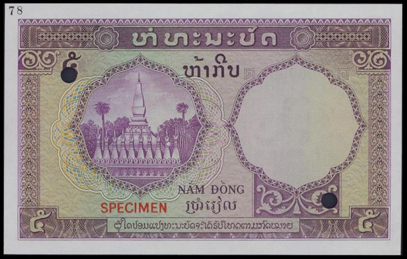 French Indo China, 5paistres=5riels, Cambodia issue, no date (1953), serial number 000000, purple and green, shrine at left, value in different scripts, reverse shows coastal scene at left and right, geometric design at centre, hold punch cancelled, red 'SPECIMEN' overprint,