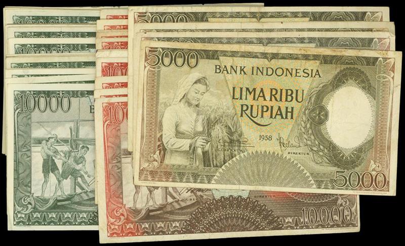 Indonesia, a group of 5000 rupiah(4), 1958, 10000 rupiah(13), red, 1964, 10000 rupiah(37), dark green, 1964, (Pick 64, 99, 101), very fine to extremely fine.(54)