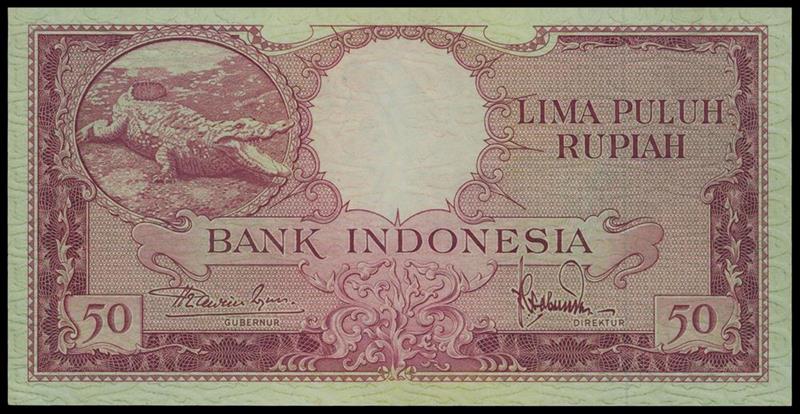 Indonesia, 50 Rupiah, ND(1957), serial number NC26213, brown on yellow underprint, corcodile at top left, reverse blue,