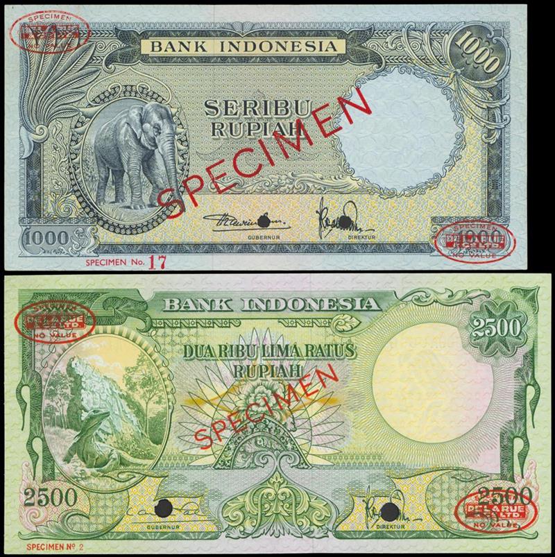 Indonesia, 1000 and 2500Rupiah, 'Specimen', no date (1957), featuring an elephant and leguan respectively, hole punch cancelled, red 'SPECIMEN' overprint,
