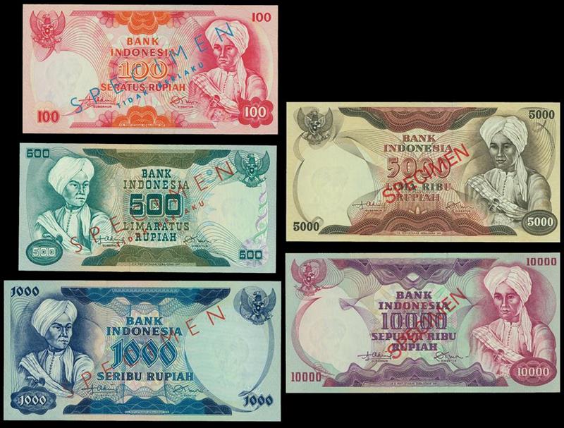 Bank Indonesia, Specimen set of 100 , 500, 1000, 5000, 10000 Rupiah, ND(1975), serial number XAJ 001825, XAF 004575, XAU 000319, DJ 000000, DC 000000 respectively, Prince Diponegoro on obverse, red, green ,blue,olive and purple on multicoloured underprint respectively,