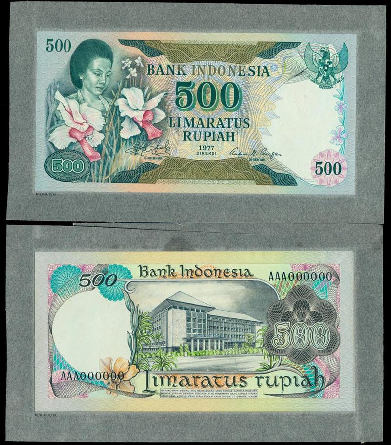 Bank Indonesia, 500 Rupiah, 1977, an obverse and reverse composite essay on cards, serial number AAA 000000, green, red and multicolour, reverse yellow and multicolour,