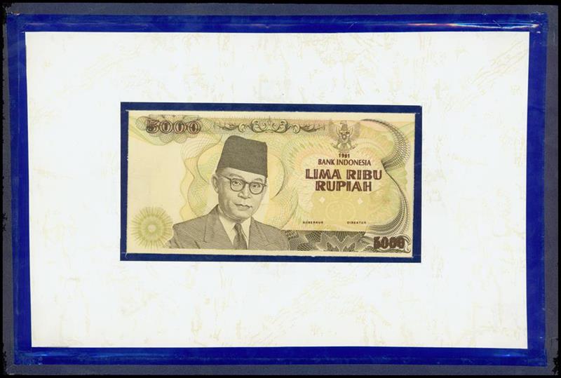 Bank Indonesia, 5000 Rupiah, 1991, an obverse and reverse composite essay on cards binded in booklet form, black, green and multicolour, reverse yellow, black and multicolour,