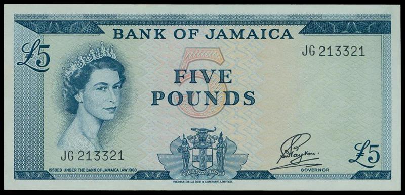 Jamaica, $5, 1960, serial number JG 213321, blue on multicoloured underprint, arms at low centre, Elizabeth at left, reverse blue, factory at centre, woman with fruit at right,