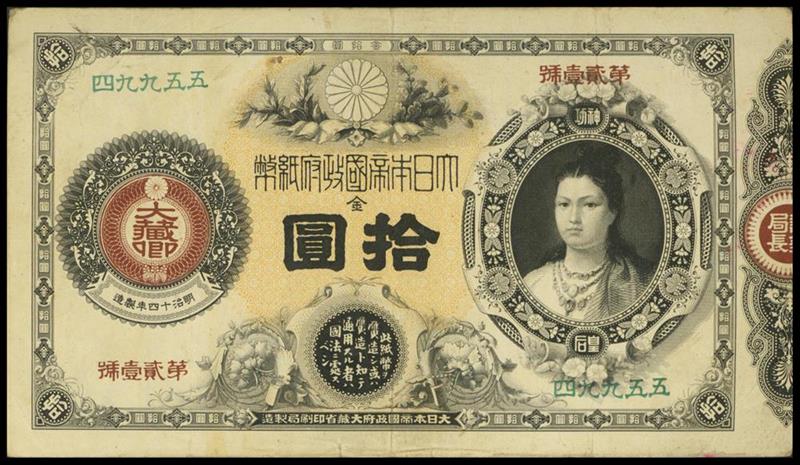 Japan, 10 Yen, 1881, serial number 49955, black on pale brown, Empress Jingu at right, reverse pale blue and red,