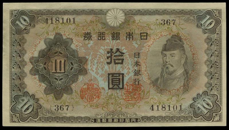 Japan, consecutive run of 10 x 10 Yen, ND(1943-44), black on light blue and multicoloured, portrait on obverse, reverse black and yellow, shrine at centre,