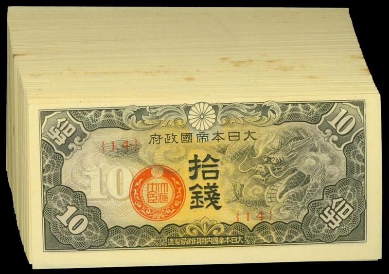 Japanese Imperial Government, a group of 10 sen (95), ND (1940), all block 14, black on yellow-orange and purple underprint, dragon at right