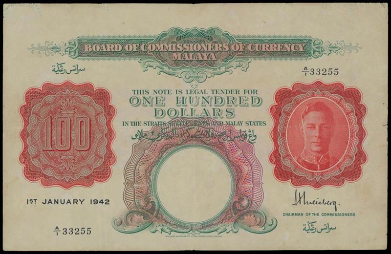 Malaya, $100, 1942, serial number A/1 33255, green and red on white, George VI at right, tiger watermakr bottom centre, reverse red, various coat of arms,