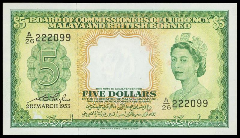 Malaya & British Borneo, $5, 1953, serial number A/26 222099, green on yellow and red, Elizabeth II at right, value at left, watermark of lion at centre, reverse green,