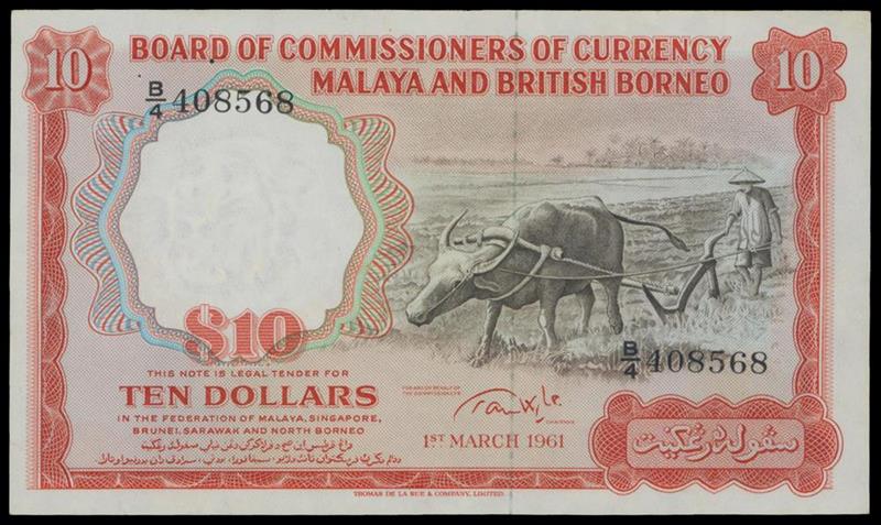 Malaya & British Borneo, $10, 1961, serial number B/4 408568, black and red, farmer ploughing with ox at right, watermark at left, reverse red, five arms around value, staple holes,