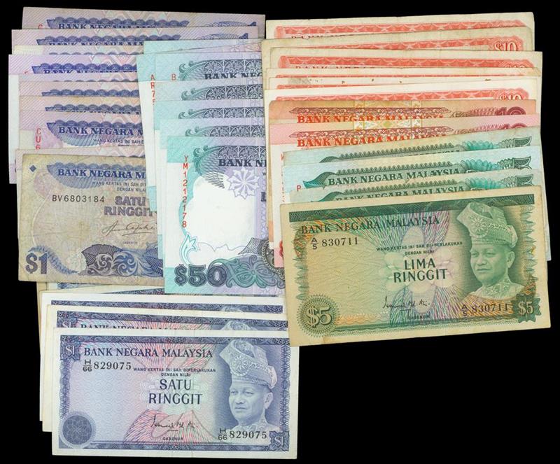 Malaysia, mixed lot of 1 ringgit(18), 5 ringgits(4), 10 ringgits(8), 50 ringgits(7), blue, green, red, dark green respectively,