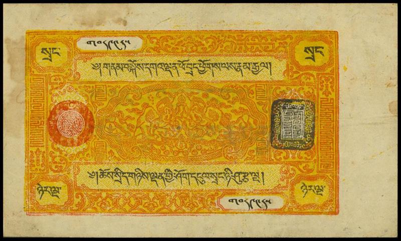 Tibet, 25srang, 1941-1948, orange on yellow, two lions at centre,