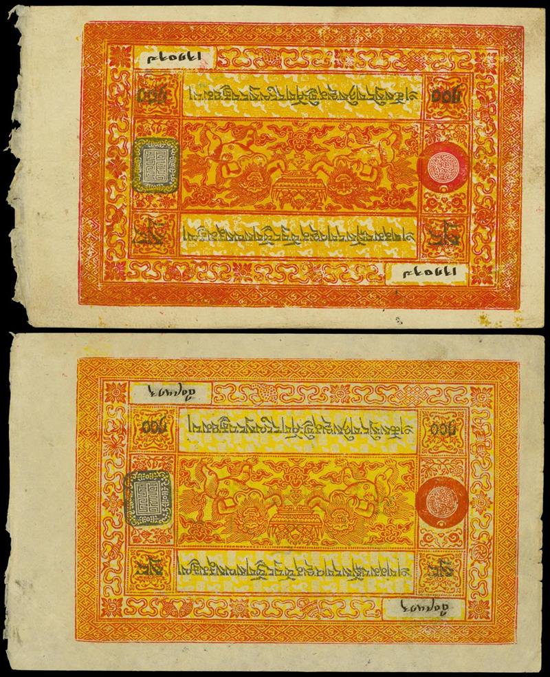 Tibet, lot of 2x 100srang, 1942-1959, orange on yellow, two lions with fruit bowl at centre,