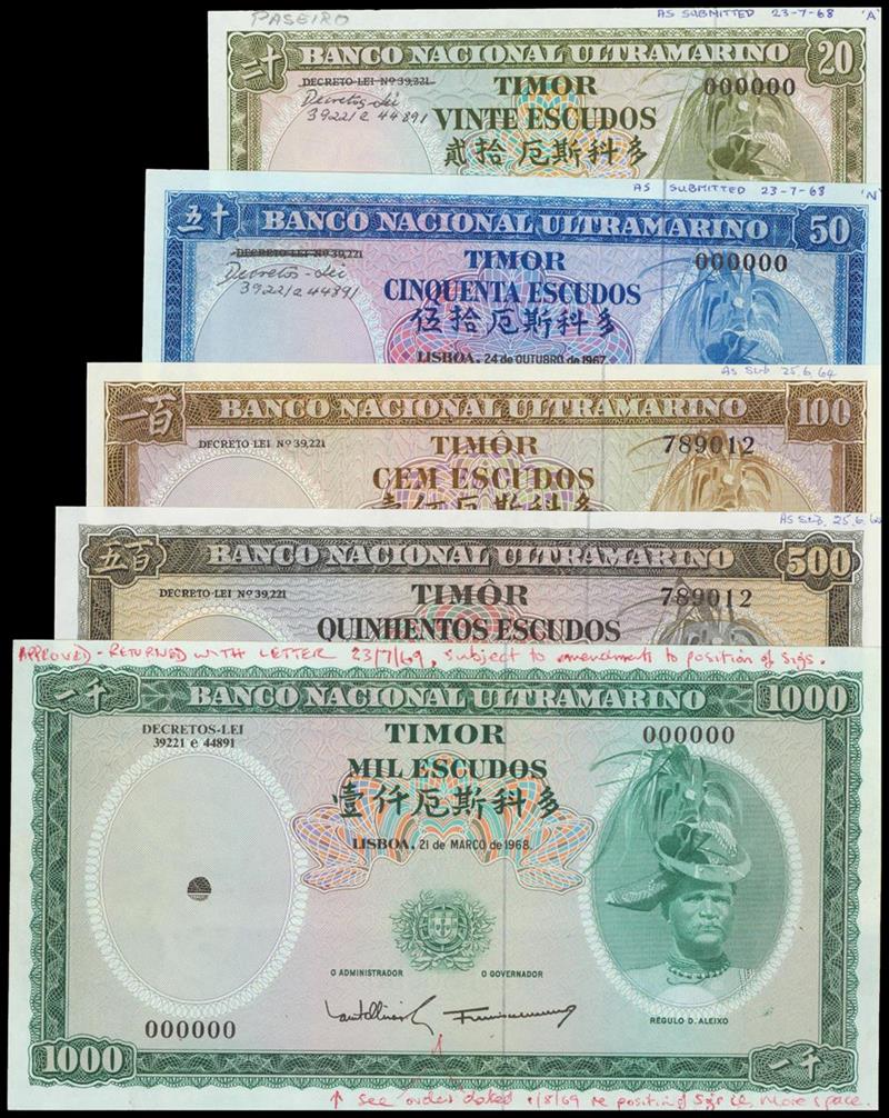 Timor, set of 5 Specimens, 20, 50, 100, 500 and 1000escudos, 1963-1968 issue, olive-brown, blue, brown, dark brown and green on multicoloured underprint, all depicting R.D. Alexio at right,
