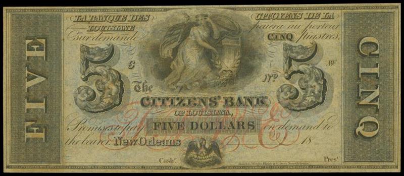 Citizen's Bank of Louisiana, $5, unissued remainder, New Orleans, 18xx, black, allegorical figure holding a staff with a bag of coins top centre, reverse blue,