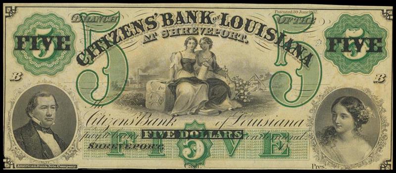Citizen's Bank of Louisiana at Shreveport, $5, unissued remainder, 1857?, green and black, allegorical women top centre, reverse red,