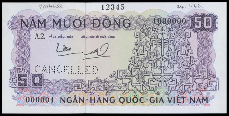 South Vietnam, 50dong, 'specimen', no date (1966), black serial numbers, purple and multicoloured, leaf tendrils at right, reverse purple, floral designs,