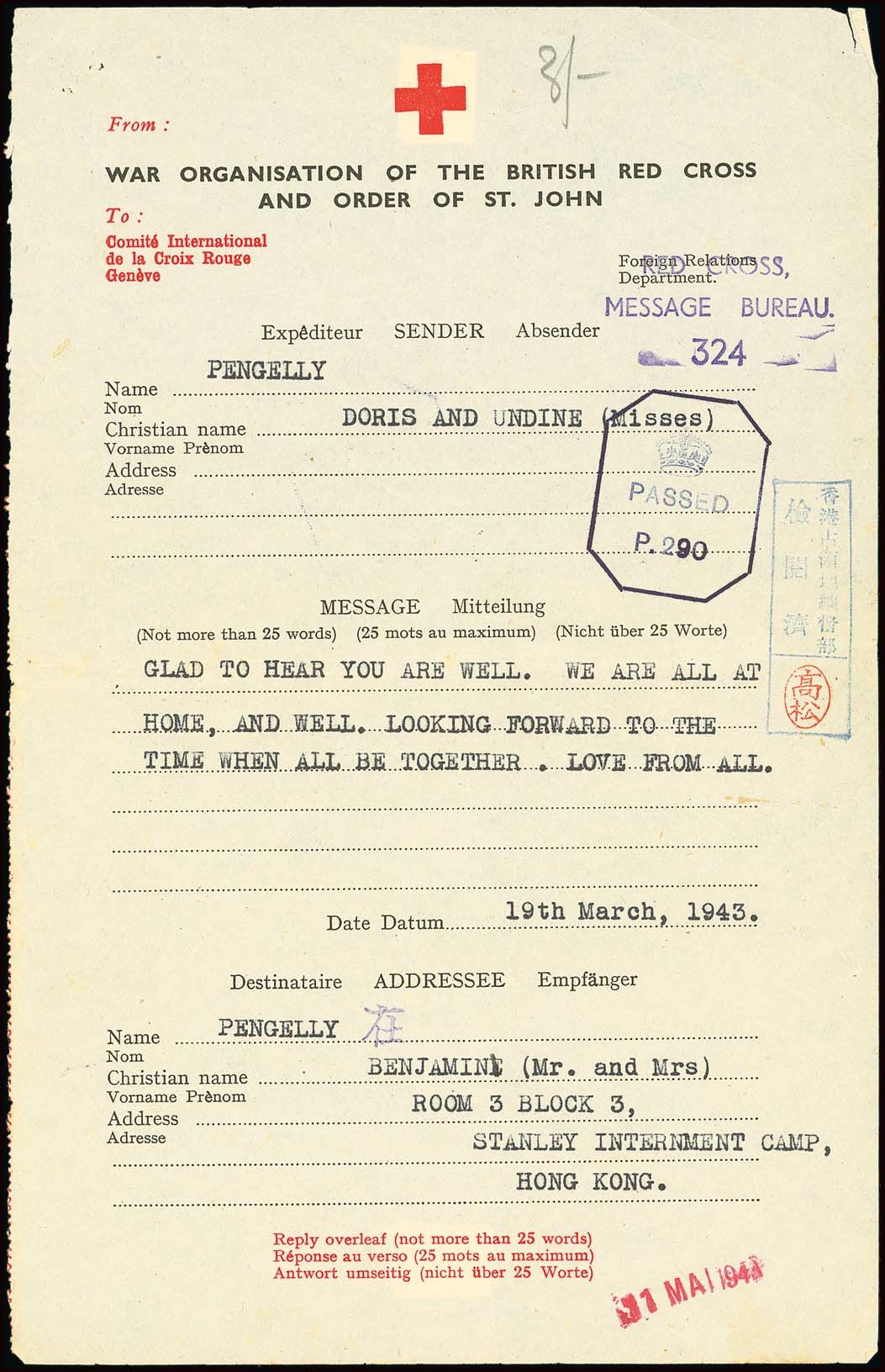 From U.K. - Red Cross Message: 1943 (19 Mar.) letter sheet to the Pengellys bearing British "P.290" censor handstamp in blue-black, "red cross,/message bureau./324" in violet with the associated datestamp "31 MAI 1943", and Governor General's Department censor handstamp in blue with Takamatsu seal. The is also a handstamp kai after the recipient's name meaning present. Some minor creasing. Tett fig. 4-4-19. Photo