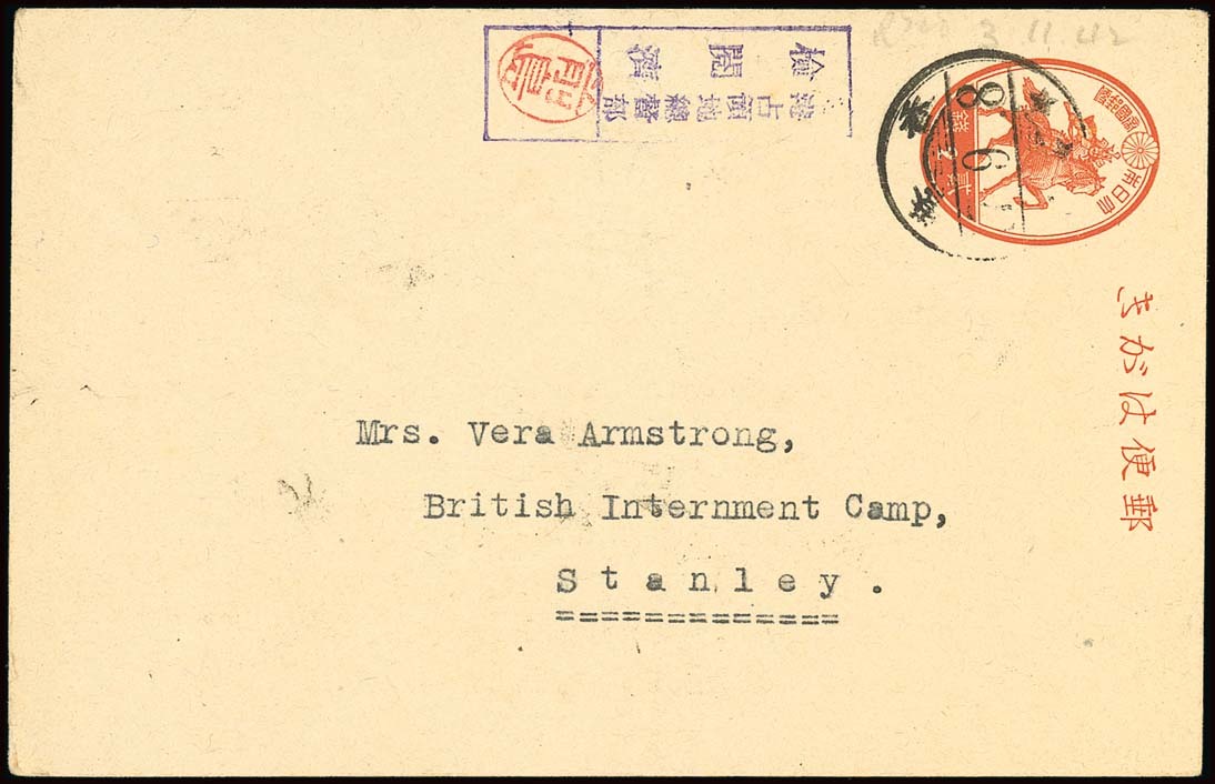 Hong Kong: 1942 (8 Sept.) 2s. stationery card to Vera Armstrong, cancelled by Hong Kong c.d.s. with Governor General's Department censor handstamp in violet with Maejima seal and pencil date of receipt "3.11.42". The card is from a Swiss national but does not state the nationality. Fine. Tett fig. 4-4-12. Photo