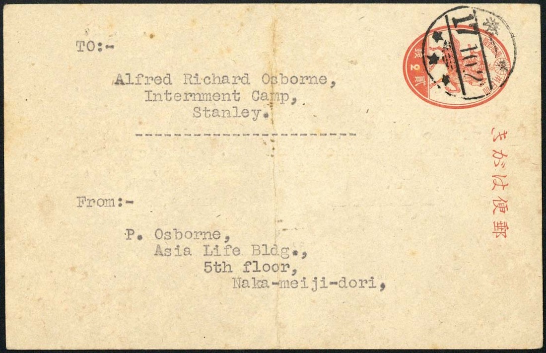 Hong Kong: 1942 (17 Oct.) 2s. stationery card to Alfred Osborne with typed message and, on the reverse, "Replied 14/12/42". Unusually without any censor marking. Vertical folding crease. Tett fig. 4-4-14