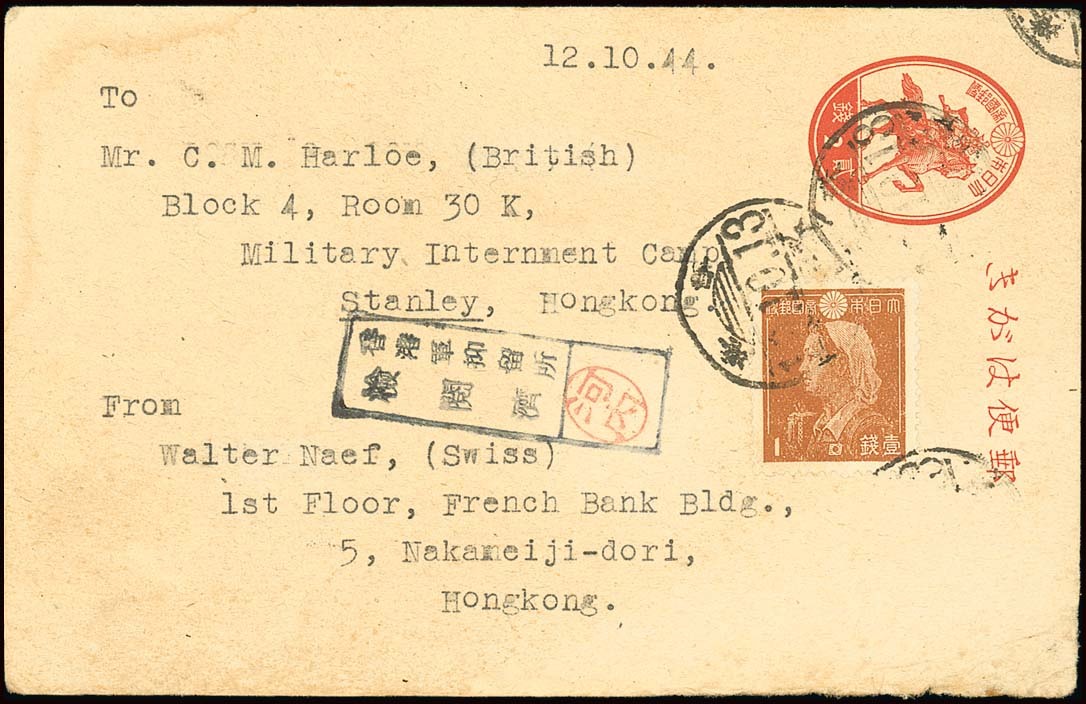 Hong Kong: 1944 (13 Oct.) 2s. stationery card, uprated with 1s. (a further adhesive has fallen off) cancelled by Hong Kong c.d.s., with Military Internment Camp censor handstamp in blue-black with Kawauchi seal, sent by a Swiss national. Light soiling. Tett fig. 4-4-40. Photo