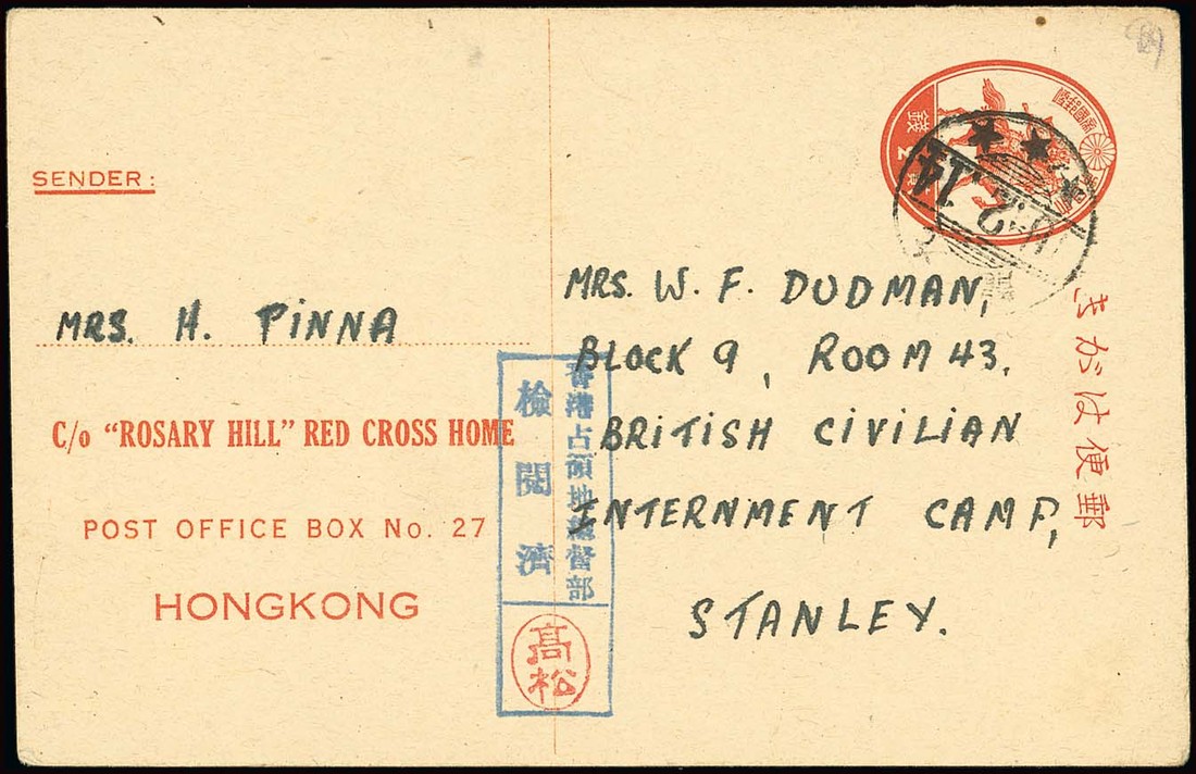 1944 (14 Feb.) 2s. stationery card from the 'Rosary Hill' Red Cross Home printed in red, sent to Mrs Dudman and bears a fine strike of Governor General's Department censor handstamp in blue with Takamatsu; light soiling. Scarce. Tett fig. 4-4-42. Photo