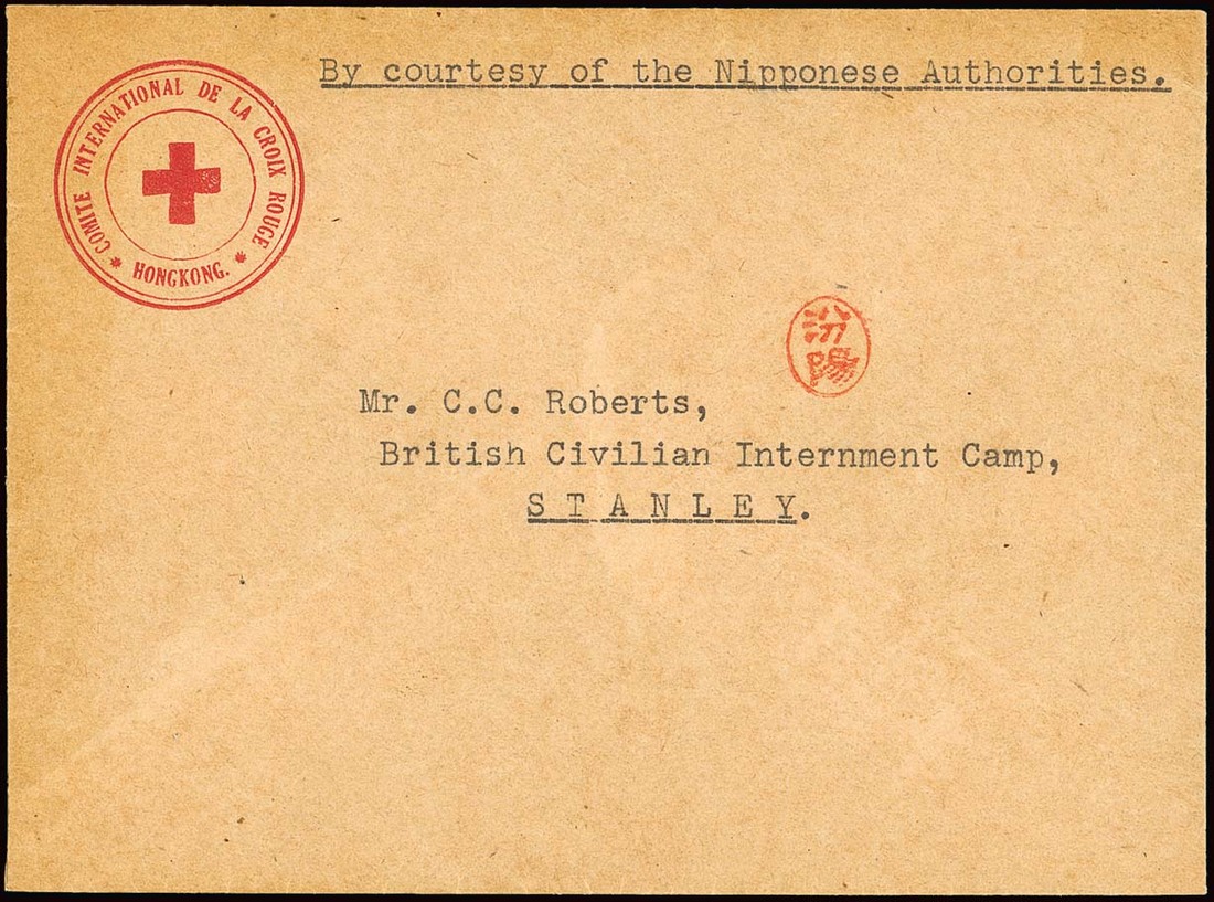 Hong Kong Red Cross Envelope: Undated envelope to C.C. Roberts "By courtesy of the Nipponese Authorities" bearing a fine strike of the the Hong Kong Red Cross handstamp in the upper left corner and with Funyu seal; no further markings. Some light wrinkling. A very scarce cover. Tett fig. 4-4-11. Photo