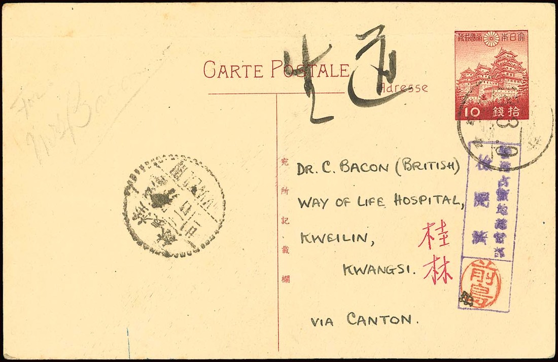 1943 (2 Apr.) 10s. stationery card from Graham Watt "C/o Foreign Affairs Department" in Stanley Camp, addressed to a friend in a hospital in Kweilin (Free China), cancelled by Hong Kong c.d.s. with Governor General's Department censor handstamp in violet with Maejima seal and bearing Kweilin arrival c.d.s. (20.4) on each side; vertical folding crease. Fine and a rare destination. Tett fig. 4-5-21. Photo