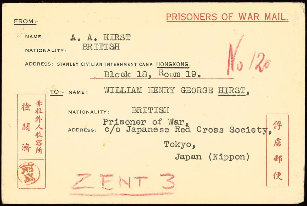 1943 (29 Nov.) special post card from Aleitha Hirst to a relative who had been relocated to Japan, with Maejima seal and "zent 3" in red crayon and "No 120"; the reverse with Fujita seal. Zentsuji Camp was one of the first to be opened in Japan and the first P.O.W's were from Guam and Wake Island. A rare card to a P.O.W. in Japan. Tett fig. 4-5-10. Photo