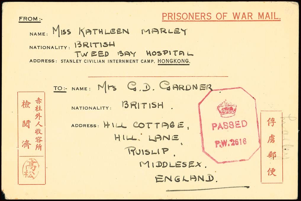 1944 (13 Jan.) Prisoners of War Mail card from Kathleen Marley in Tweed Bay Hospital to Ruislip, Middlesex bearing Takamatsu seal and British censor "P.W. 2616" handstamp in rose-red; tiny corner fault, fresh. Tett fig. 4-5-11. Photo