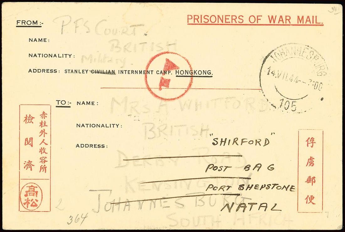 1944 (23 Jan.) Prisoners of War Mail card from Phil Court to Johannesburg and redirected to Natal, with Takamatsu seal and there is a circular South African censor handstamp and Johannesburg c.d.s. (14.7). The sender's address has had Civilian crossed through and "Military" written above. A very unusual and scarce destination. Tett fig. 4-5-12. Photo