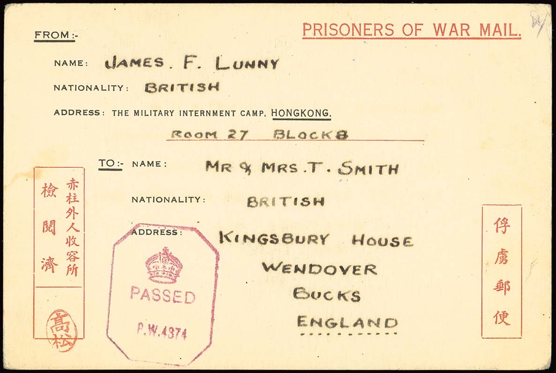 1944 (Apr.) Prisoners of War Mail card from James Lunny to his friends in Wendover, Bucks., with the new Military Internment Camp imprint but still with the incorrect Japanese censor text, bearing Takamatsu seal and British censor handstamp "P.W. 4374" in mauve; pencil on the reverse, "Received July 19 1945". The writer notes that letters 3, 4 and 6 had arrived. Tett fig. 4-5-13. Photo