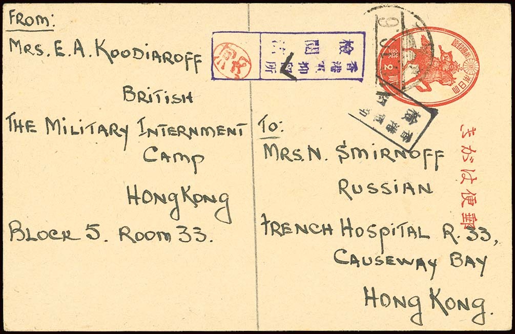 1944 (12 Aug.) 2s. stationery card from Mrs E. Koodiaroff to Mrs Smirnoff in the French Hospital in Causeway Bay, the boxed Military Internment Camp censor handstamp in violet was applied before the card was written and with Kawauchi seal; a 1s. stamp has fallen off and this had been tied by another strike of the Military internment Camp censor handstamp in black and Hong Kong c.d.s. dated 6th October, nearly two months later. Fine and an interesting card demonstrating the application of the boxed censor handstamp before the card was written. Tett 4-5-29. Photo