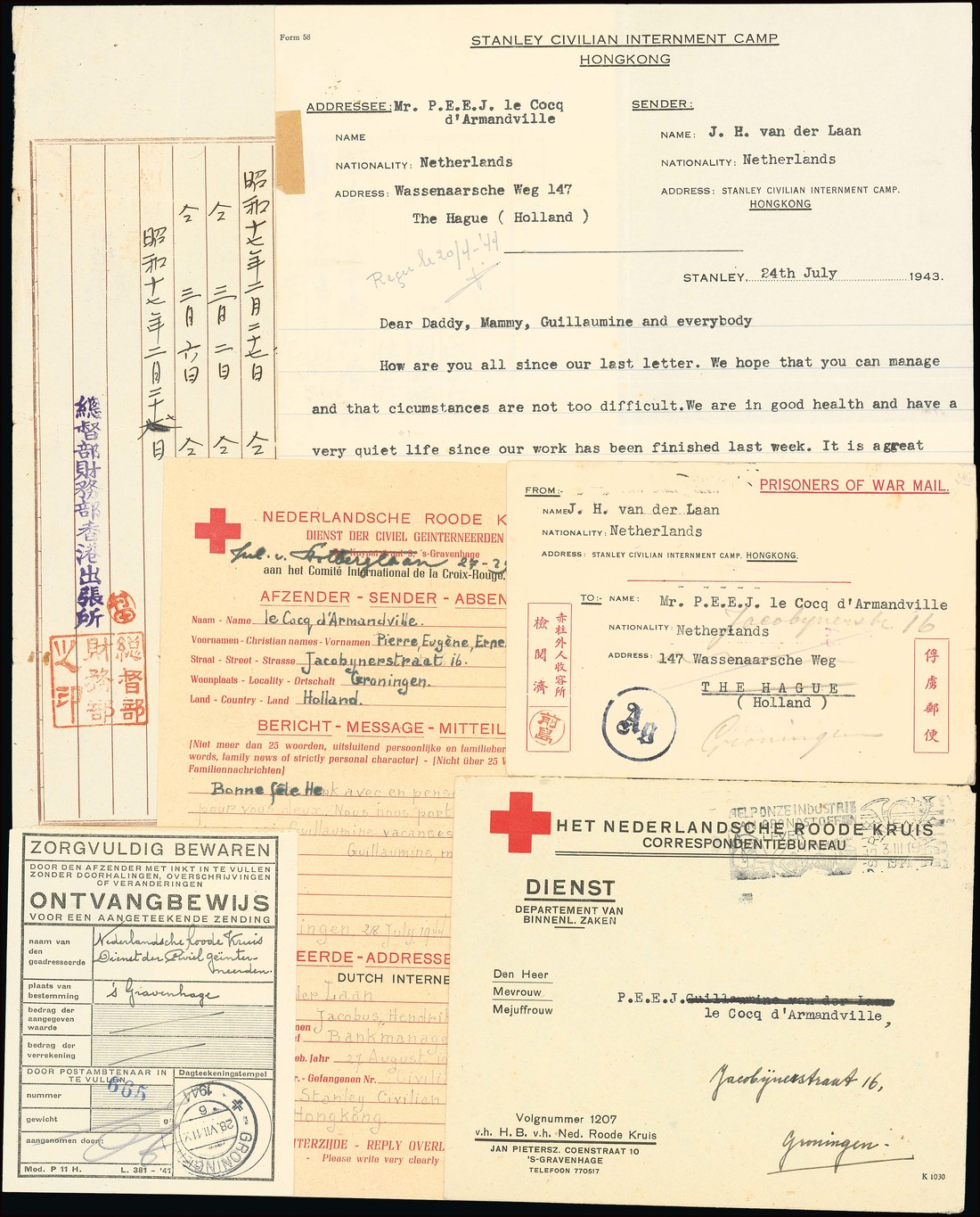 A fascinating and comprehensive collection of letters and documents relating to two parts of this family under foreign occupation in Holland and in Hong Kong. Jacobus van der Laan was employed as the manager of the Netherlands Trading Society (a bank); he and his wife were held by the Japanese in the Sun Wah Hotel (121 Connaught Road) where he was marched to his bank every morning to liquidate the bank's assets. Later they were relocated to Stanley Camp. The collection includes various Red Cross messages as both sides of the family tried to make contact with each other, a permit for Mrs van der Laan to visit hospital. 1943 Red Cross Message to Holland, " ... Since September 1941 no news telegraphed different times ..." (one telegraph message is included). 1943 (24 July) special Stanley Internment Camp envelope with letter to Holland, bearing Maejima seal and circular German censor handstamp, a note on the letter, "Reçu le 20/4-'44". 1942 (23 July) letter to the daughter and son-in-law from Hotel Polana in Lorenço Marques, with the letter (the adhesives have been removed) with South African censor seal and handstamp. 1943 (4 Sept.) Stanley Prisoner of War mail card to Holland bearing Maejima seal and British censor "P.W.1101" censor handstamp in red. 1943 (1 Oct.) Stanley Prisoner of War mail card to Holland (redirected on arrival) with Maejima seal and German censor handstamp. The collection also includes the letters from the Dutch Red Cross to the family in Holland along with a number of the registration receipts and donations to the Dutch Red Cross. The final envelope is stampless and dated November 1945 sent from the bank in Singapore to the branch in Calcutta and is marked "ex pow" in pencil, the boxed Postage Due handstamp has been crossed through in red ink and "free" added. There is also a number of other, associated items. This important series is illustrated and explained by David Tett in Chapter 10 of vol. four of his books. Photo