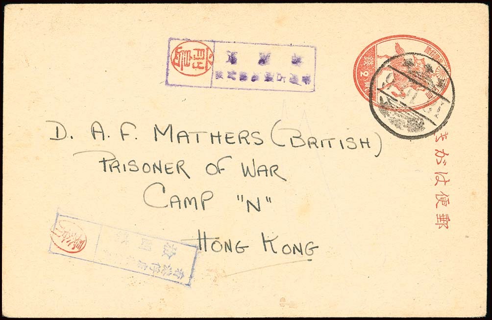 1943 (6 Oct.) 2c. card to D. Mathers cancelled by Hong Kong c.d.s. bearing Governor General's Department censor handstamp (smudged) in violet with large Maejima seal and Military Internment Camp censor handstamp in dark blue with small Hasegawa seal. A message of 49 words written by his mother in Stanley Camp. Good to fine with two censor handstamps. Tett fig. 4-6-12. Photo