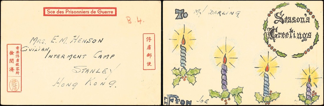 1942 (Dec.) (c.) type 1 card from Joe Henson to his wife in Stanley with illustrated "Season's Greetings", with small Hasegawa seal and "B.4." in red crayon. Fine and an early card. Tett fig. 4-6-2. Photo