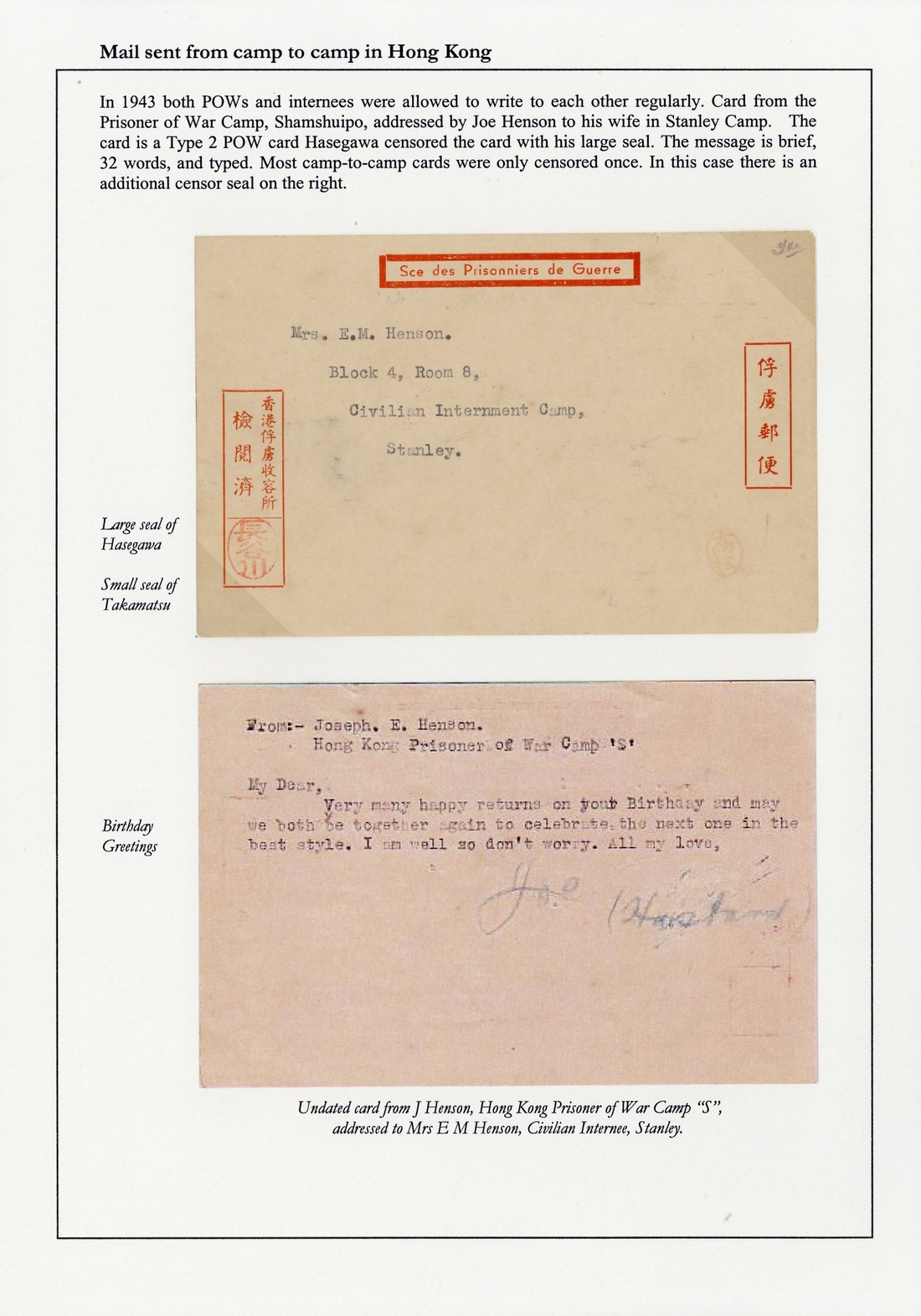 1943 Type 1 and type 2 cards between Joseph and Ede Henson (in Stanley Camp). The first from Joe bears large Hasegawa and faint Takamatsu seal sending birthday greetings; the second, dated 1943 (3 June) expresses concern and she has not received any news for six months, without censor handstamp; corner crease. (2 cards). Tett figs. 4-6-7, 10