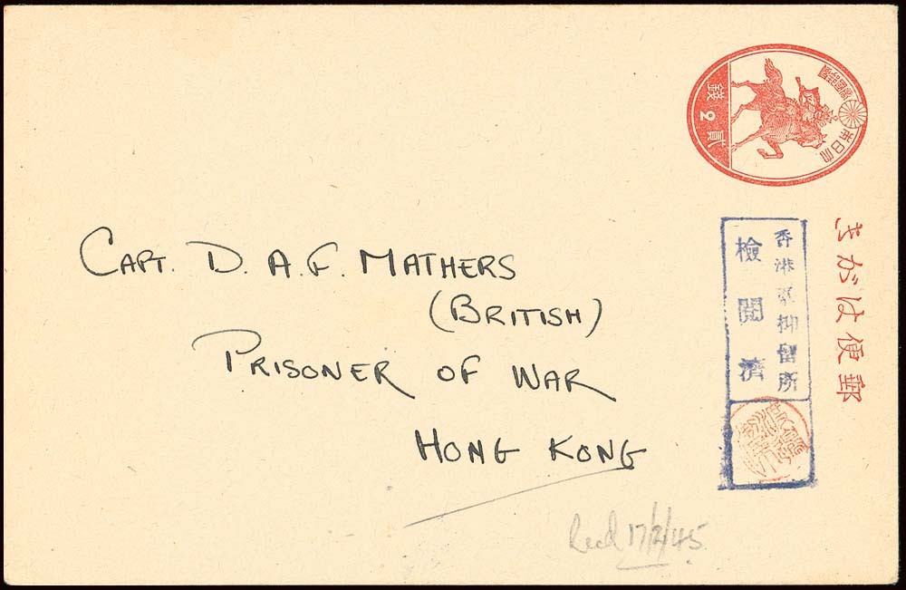 1945 (15 Jan.) 2s. card to Capt. Mathers from his mother in Stanley Camp beaing Military Internment Camp censor handstamp with a good strike of the rare Watanabe seal with pencil "Recd 17/2/45"; fine. Tett fig. 4-6-20. Photo