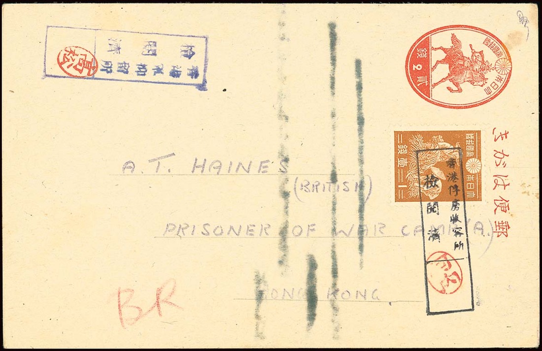 1944 (11 June) 2s. stationery card uprated 1s. to A Haine at Camp A from Violet Brown in Stanley bearing P.O.W. Camp censor handstamp in violet with Kawauchi seal and Military Internment Camp censor handstamp in black (cancelling the adhesive) with large Takamatsu seal and "BR" in red crayon; some of the message has been censored and includes "Have had no word from you for several months ...". Scarce and unusual. Tett fig. 4-6-15. Photo
