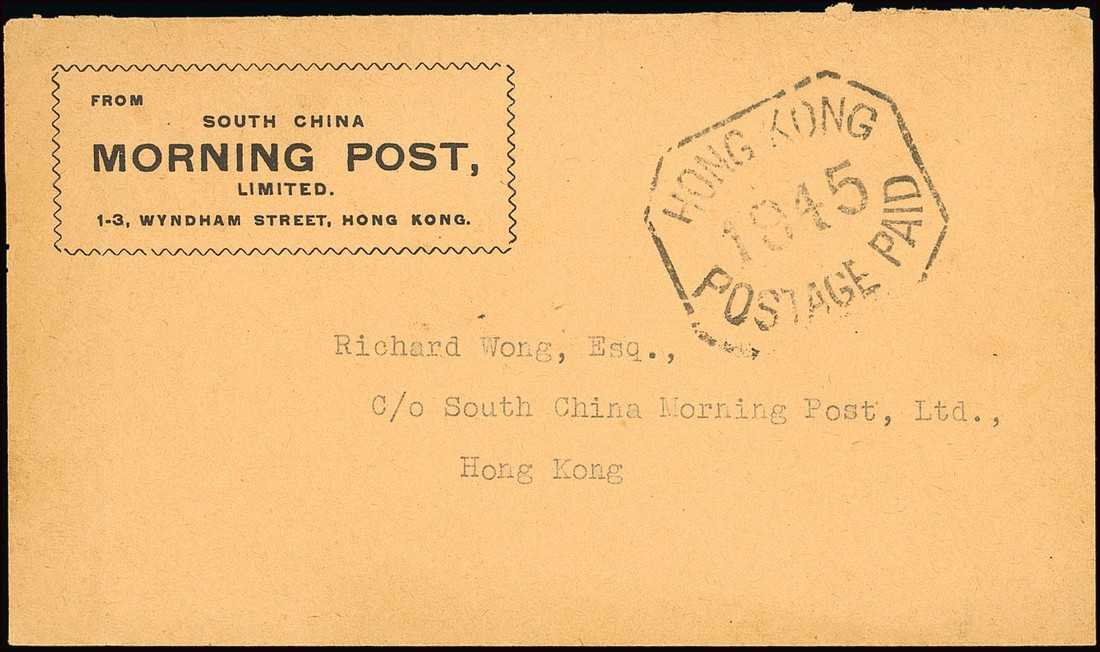1945 (15 Sept.), stampless South China Morning Post envelope giving notice of an extraordinary general meeting and bearing a good strike of the undated "hong kong/1945/post paid" handstamp; fine and unusual. Tett fig. 4-12-2. Photo