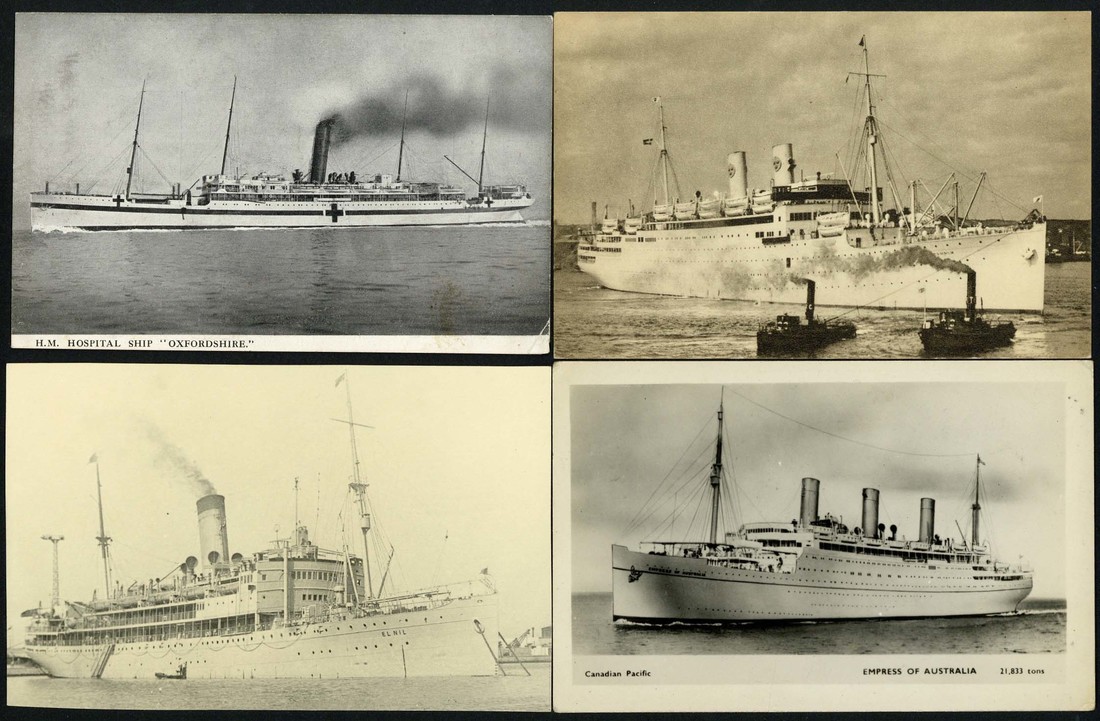 The Exchange Ships: A collection of postcards with 'Tatuta Maru', 'Kamakura Maru', 'Conte Verde', 'Asama Maru', 'El Nil', 'Narkunda', 'City of Paris', 'City of Canterbury', 'Aramis' and 'Gripsholm; also the repatriation ships, 'Highland Monach', 'Maunganui', 'Empress of Australia' and the hospital ship 'Oxfordshire'. Good to fine
