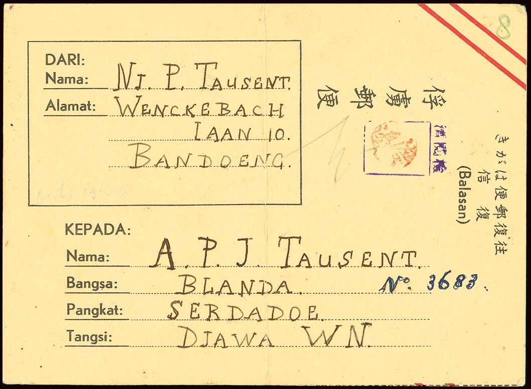 Within D.E.I.: 1945 two similar P.O.W. reply sections to A.P.J Tausent Djawa Camp WN, both bear small boxed censored handstamp with Watanabe seal; vertical folds. Scarce cards.(2 cards). Photo
