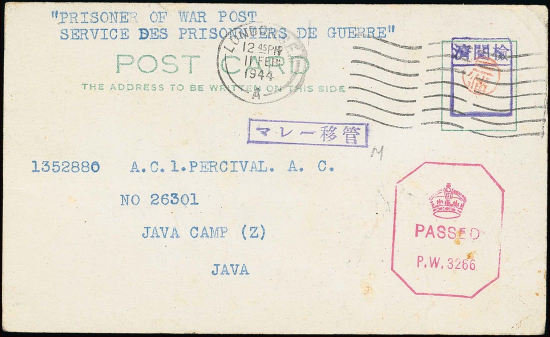 From U.K.: 1943 (28 May) "Prisoner of War Post" envelope to I.B. Collins at Java, bearing manuscript "Bat 25660" and handstruck transfer which has been altered to read Transferred to Malaya, the reverse bears the small boxed censored handstamp (fig.2-12-127) with Miura seal. Also 1944 (11 Feb.) post card to A.C. Percival, Java Camp Z, bearing London machine postmark, British censor handstamp "P.W.3266" in red, boxed Censored handstamp with Miura seal and boxed Transferred to Malaya (creased). Good covers to prisoners transferred back to Malaya. Tett figs. 2-3-21, 23. (2 covers). Photo