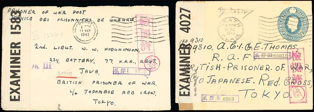 From U.K.: 1943-44 a group of covers to British prisoners with 1943 (22 Apr.) envelope to Clifford Beales bearing British censor seal "571", large boxed Censored handstamp in red with Suzuki seal and small boxed Java HQ handstamp with prisoner's number (ex Crabb); 1943 (18 May) envelope to 2nd Lieut. W.W. Hodgkinson, Java, with Derby machine postmark, British censor seal "1583", large boxed Censored handstamp with Suzuki seal, boxed Java district 1 handstamp and Java III handstamp, both with prisoner's number; 1943 (14 June) 2½d. stationery envelope to G.E. Thomas cancelled by Neath machine postmark, British censor seal "4027", large boxed Censored handstamp in red with Suzuki seal, boxed Java III crossed through with boxed HQ handstamps; 1944 (8 Feb.) envelope to E.R. McDaniel with Kensington machine postmark, British censor seal "4181", boxed Censored handstamp in red and Permission in violet with Tanaka seal and boxed HQ handstamp with number, pencil "R 9/10/44"; 1944 (17 Mar.) post card to Frederick Tulley with Stratford machine postmark, British censor handstamp "P.W.4768", boxed Censored with Ujiie seal and Permission with Tanaka seal, both in red, boxed camp III handstamp with number; 1944 (8 Oct.) 3d. Prisoner of War Post air mail card to Frank Graham, X Camp, despatch c.d.s., British censor handstamp "P.W.2709", boxed Censored handstamp in red with Suzuki seal and boxed camp I handstamp with number. A good group. Tett figs. 2-3-25, 26, 28, 29, 30, 31. (6 covers). Photo