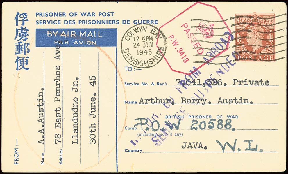 From U.K.: 1945 (24 July) 1½d. Prisoner of War Post air mail card to Arthur Austin, cancelled by Colwyn Bay machine postmark, with British censor handstamp "P.W.3413" in red and unframed "returned from abroad/service suspended". Fine and a scarce marking. Photo