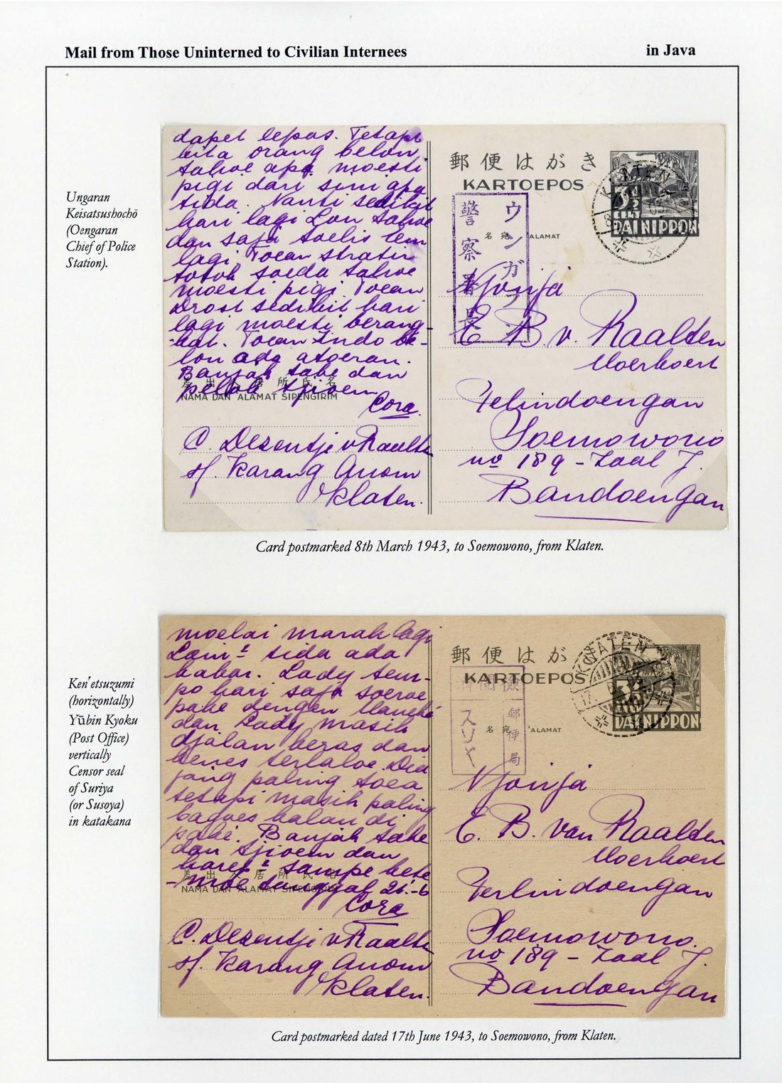 1943 (Mar. - June) three Dai Nippon 3½c. stationery cards to E. Raalten in Soemowono, cancelled by Klaten c.d.s. bearing a good strike of the boxed Oengaran Chief of Police Station handstamp in purple (white card stock), the others with the boxed Censored Post Office handstamp in purple with Mosu and Suriya seals respectively. A good group. Tett figs. 2-5-11 to 13. (3 cards)