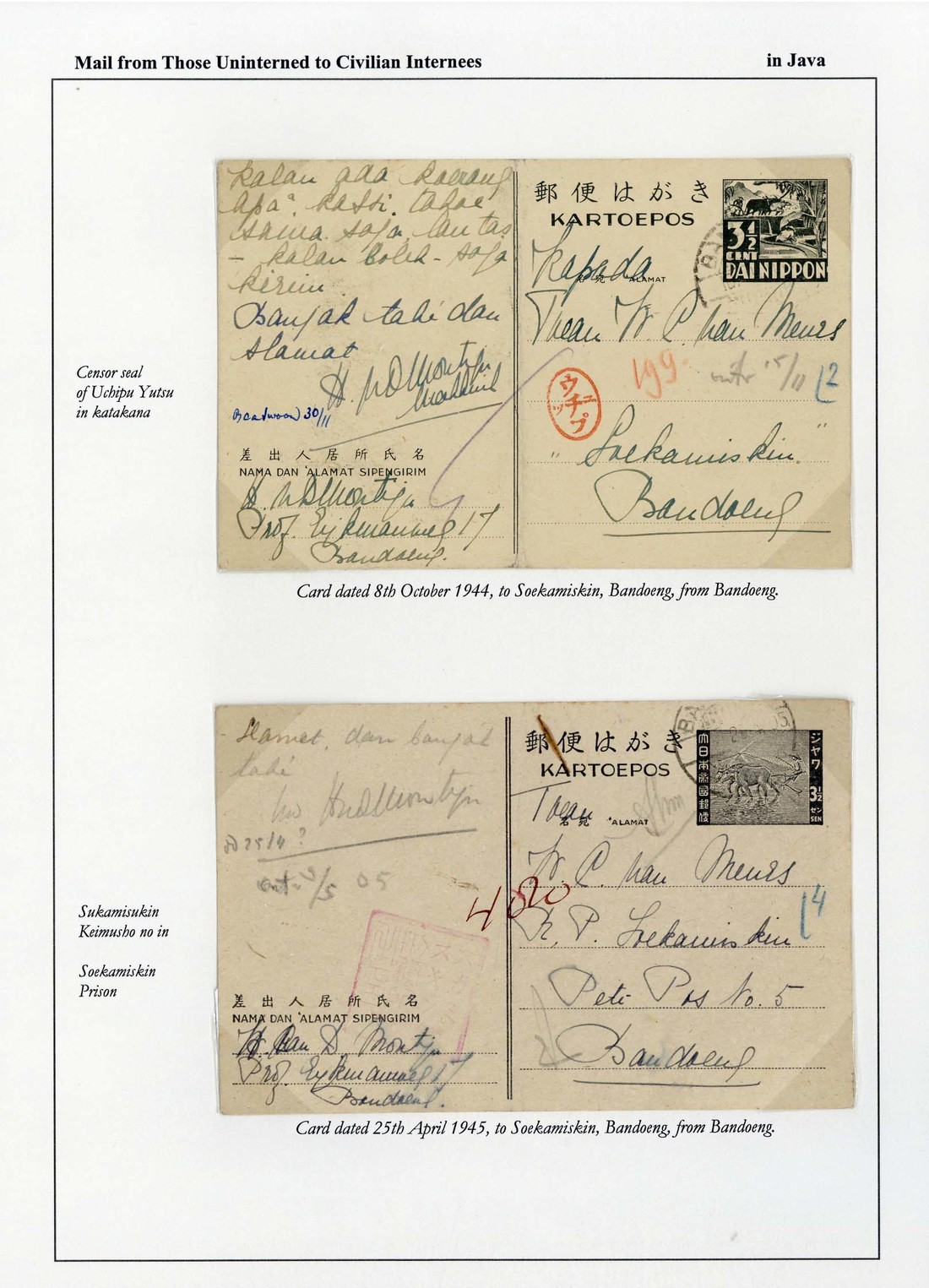 1944-45 two cards to W. Meurs locally used in Bandoeng to Soekamiskin, the first is a 3½c. bearing a good Uchipu seal, the second is a 1945 3½c. card (JSCA 3 JS 1) bearing a fair strike of boxed Soekamiskin Prison handstamp in rose-carmine. Tett figs. 2-5-20, 21. (2 cards)