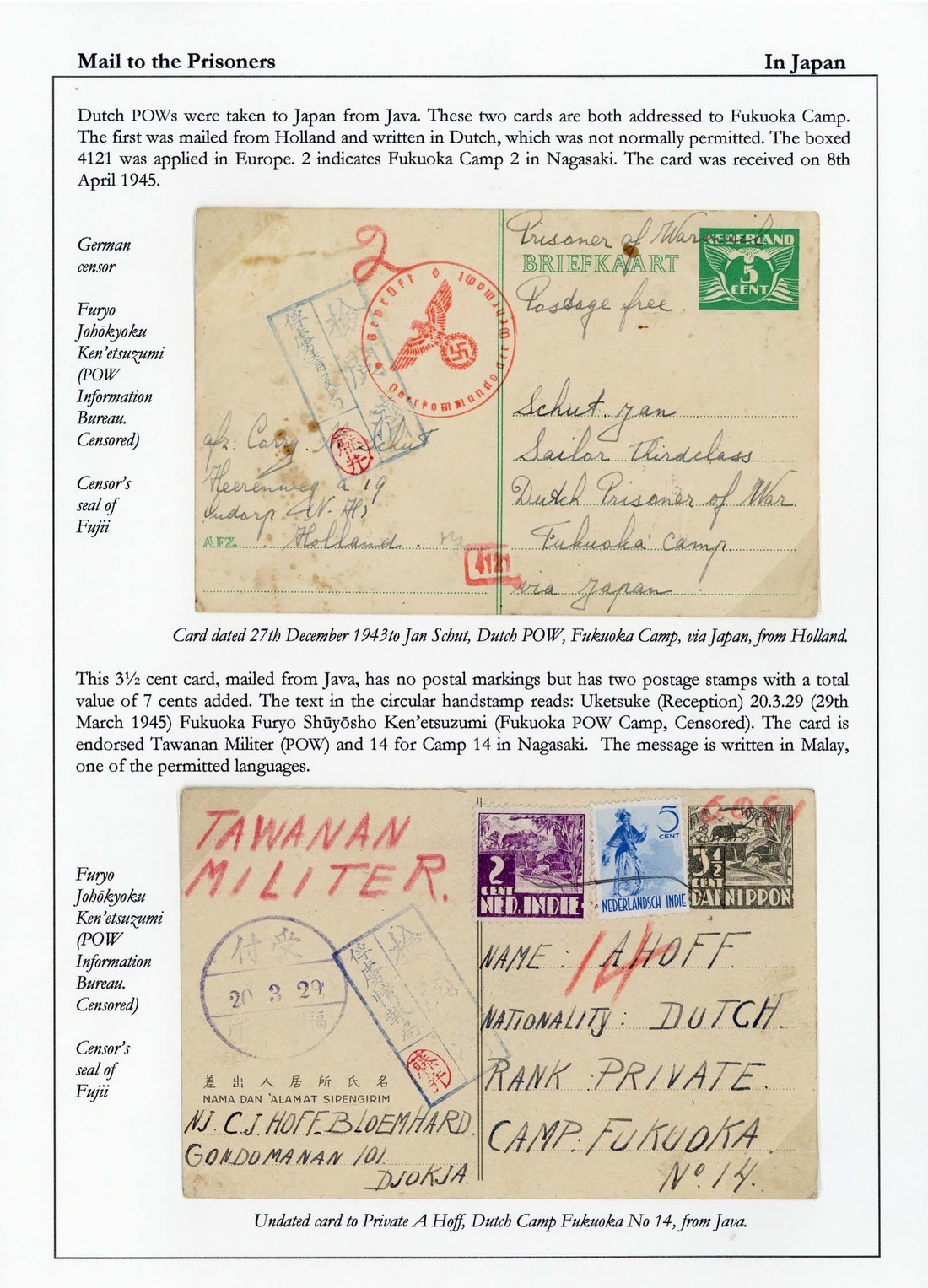 To Japan: 1944 3½c. Dai Nippon stationery card from Jakarta uprated 7c., cancelled by pen stroke, to A. Hoff in Fukuoka 14 Camp with "tawanan militer" and "14" in red crayon plus circular Reception dated handstamp for 1945 (29 Mar.) and Fukuoka POW Camp Censored handstamp in blue with Fujii seal. Also 1943 (17 Dec.) Netherlands 5c. stationery card to Jan Schut, uncancelled with a fine strike of circular German censor in red, sent to Fukuoka "2" camp and bearing Fukuoka POW Camp Censored handstamp in blue with Fujii seal; received on 8th April 1945. A good pair of cards. (2 cards)